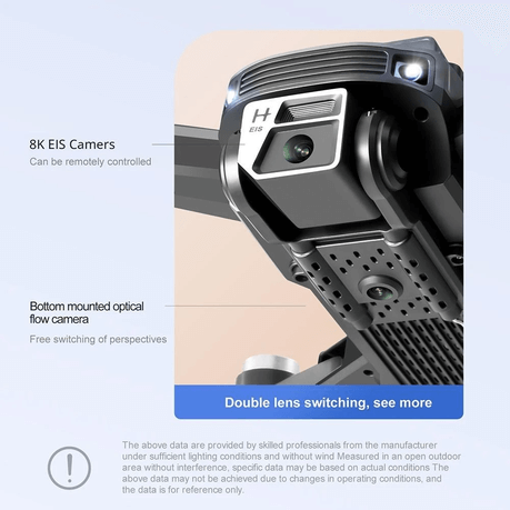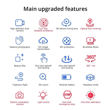 Brushless optical flow altitude hold, electrically adjustable camera angle, four-way obstacle avoidance, body running lights, foldable design, and six-channel with gyroscope.